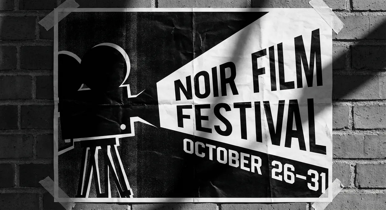 Monochrome black-and-white poster with high contrast, dramatic lighting, bold graphic elements.